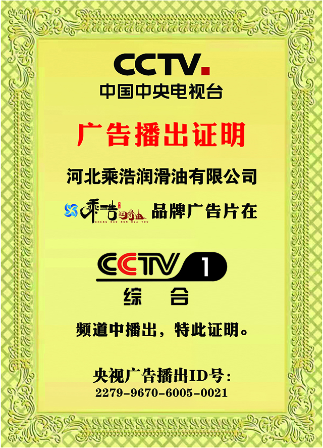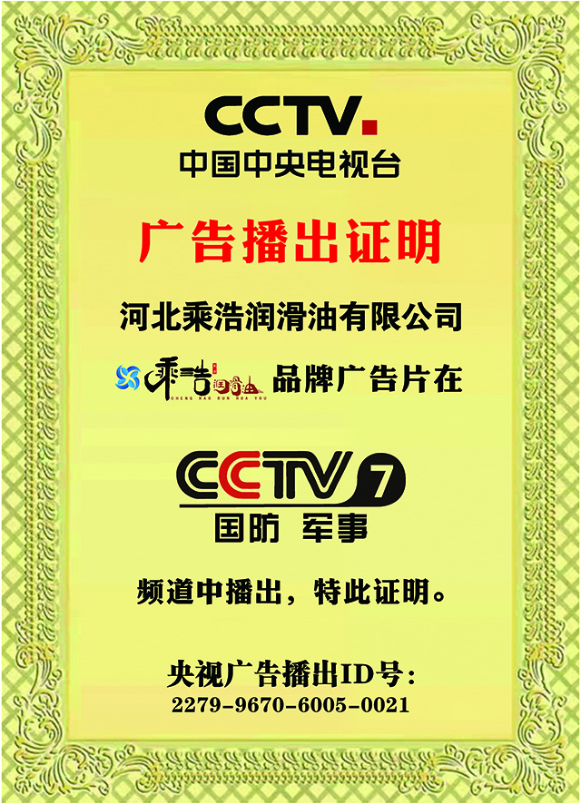 中国中央电视台展播品牌,相信品牌的力量————乘浩润滑油于2022年3月开始在CCTV-1、CCTV-7、CCTV-17同时播出,打造润滑油产业领导品牌,我们一直在努力,乘浩润滑油,给您爱车持久保护。
